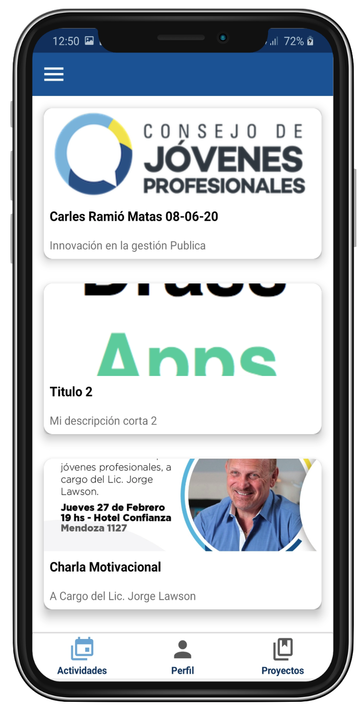 Aplicación de fidelización de clientes de un colegio profesional donde, los usuarios registrados, pueden visualizar las siguientes actividades, eventos pasados y una zona de credenciales con QR. Todo esto gestionado por un backend ad-hoc proporcionado al colegio