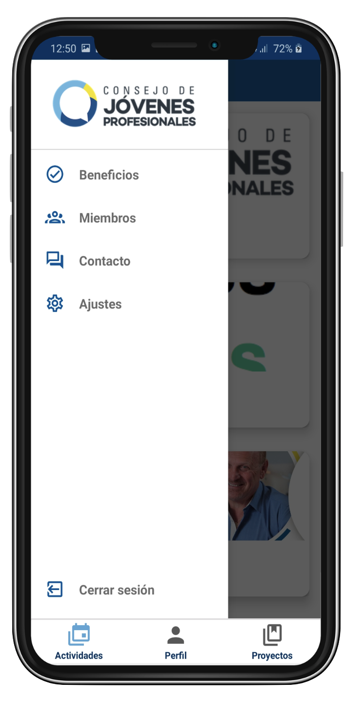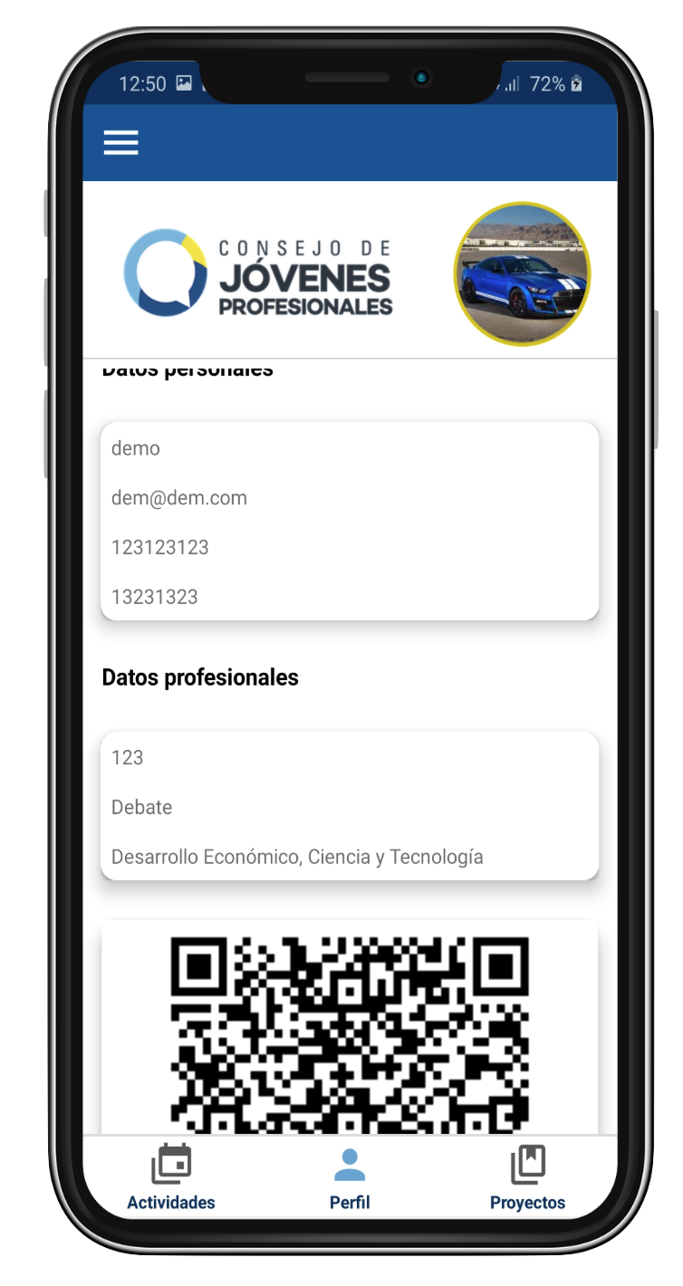 Aplicación de fidelización de clientes de un colegio profesional donde, los usuarios registrados, pueden visualizar las siguientes actividades, eventos pasados y una zona de credenciales con QR. Todo esto gestionado por un backend ad-hoc proporcionado al colegio